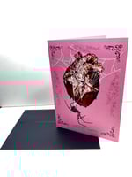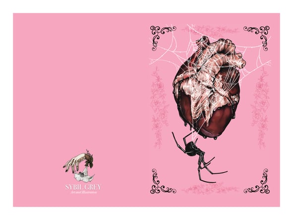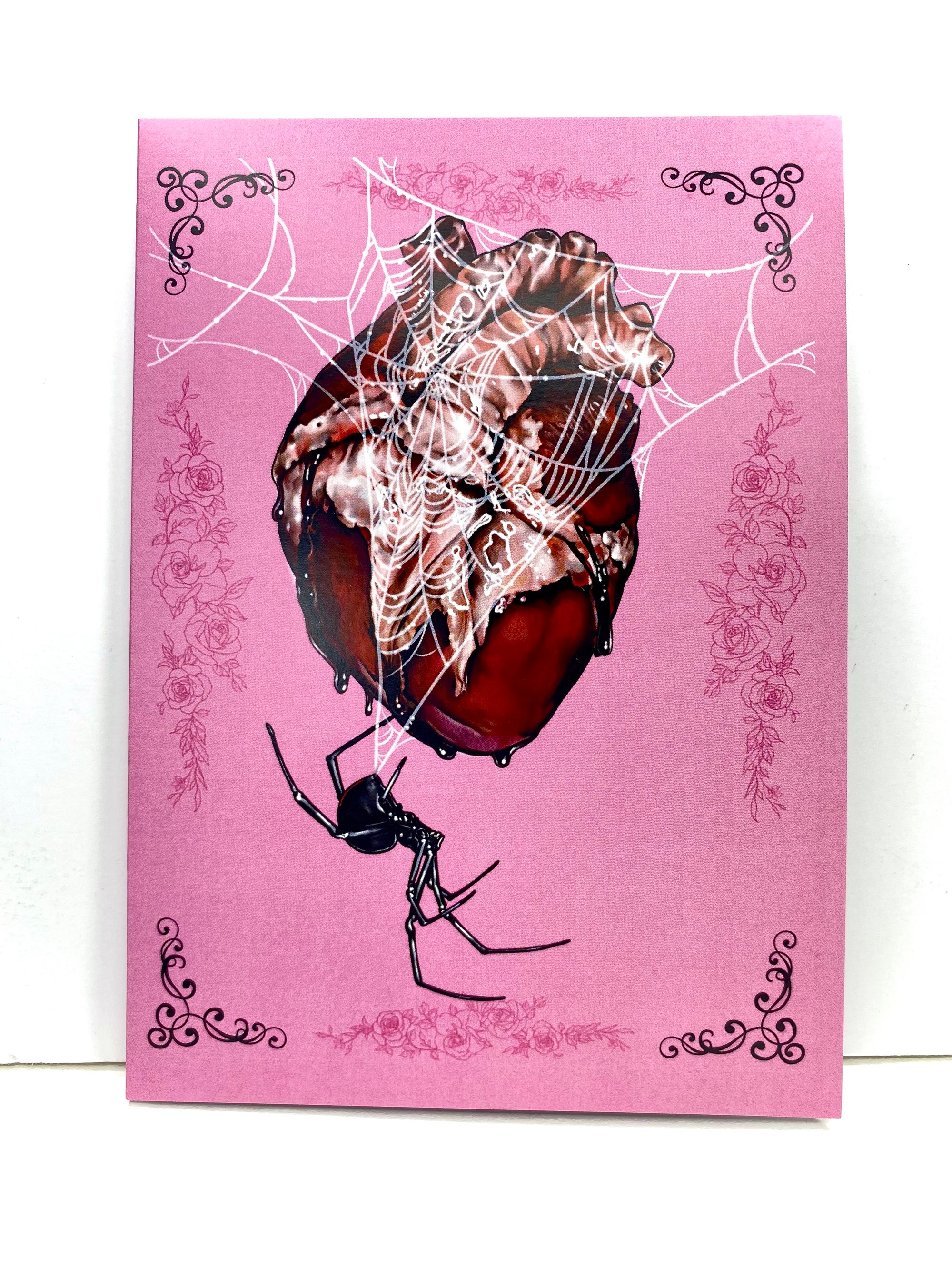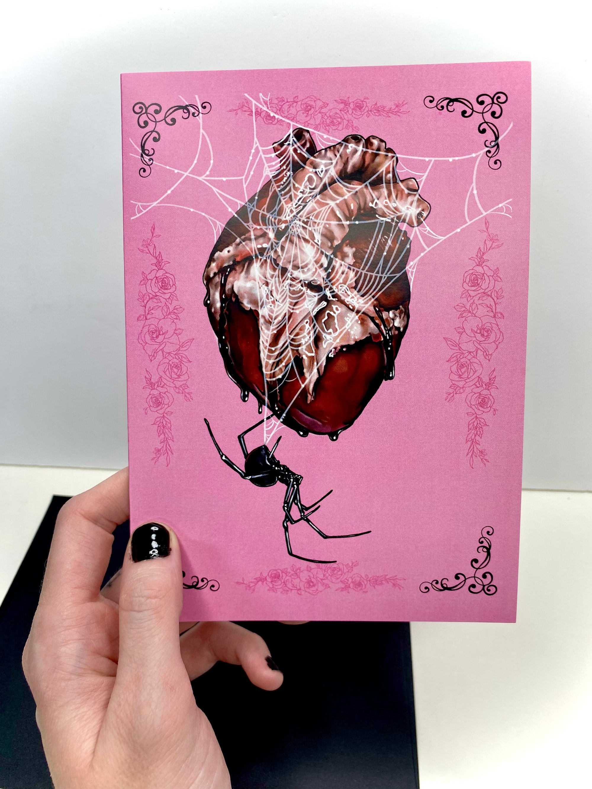 5" x 7" Greeting cards featuring a black widow weaving a web on a bleeding anatomical heart, illustrated by Sybil Grey.
