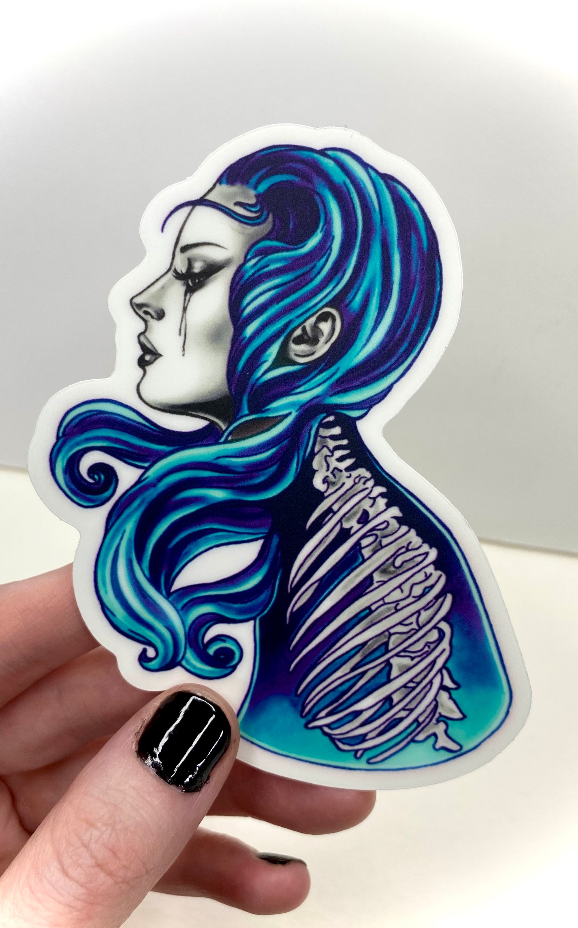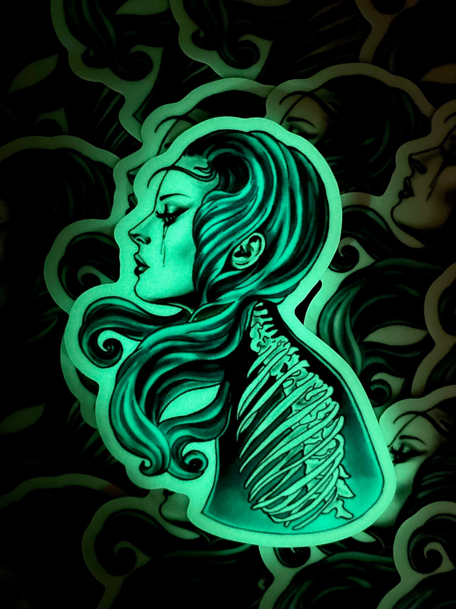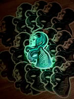 Original Anatomy Girl painting by artist Sybil Grey rendered into a Glow-In-the-Dark sticker. The blue color picked by popular demand.