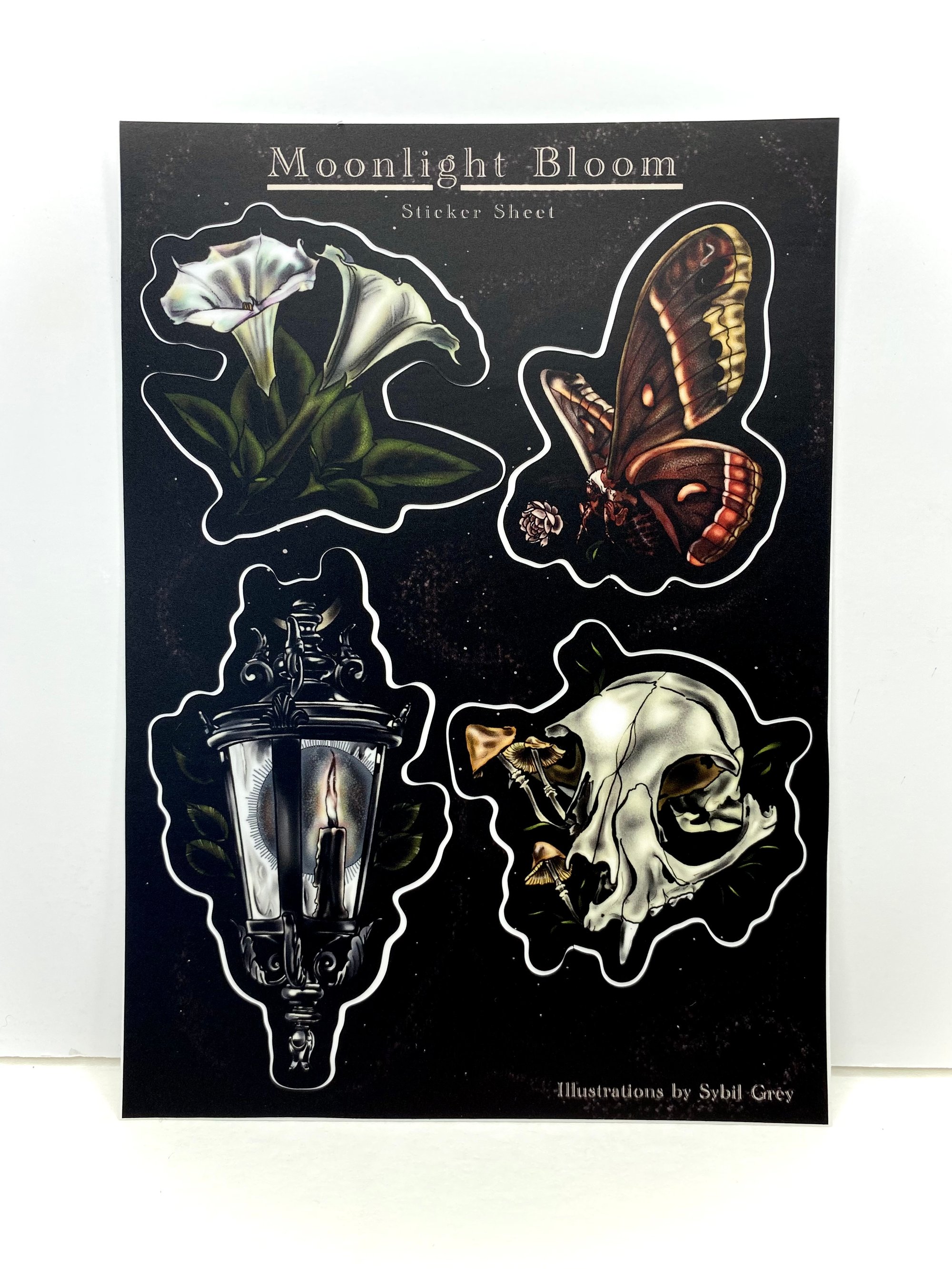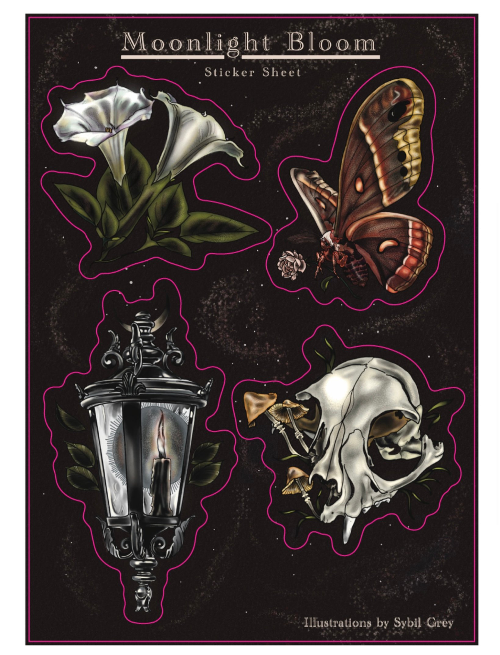 Sticker sheets featuring the mysterious allure of the moonlight, illustrated by Sybil Grey.